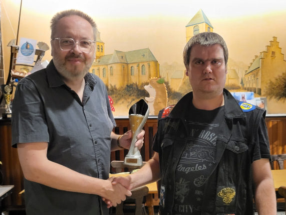 Toen ik klaar was waren er nog 5 partijen bezig, waaronder die van Jelle. We zouden dus nog even moeten wachten om hem zijn echte Beker te overhandigen.