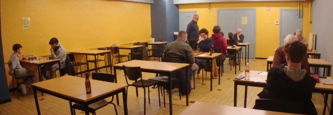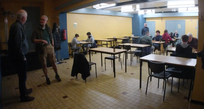 Ik bleef even in de zaal rondkijken. Zo zag ik Jef ten onder gaan tegen Elyas (met een mooi mat net die Jef – zei hij me nadien – niet had gezien) en toen ik terug in het café kwam zag ik in een bepaalde volgorde Johan binnenkomen die gewonnen had tegen Benjamin en daar zeer fier op was en Michel die een remise had gespeeld tegen Mykyta en waar ik onzeker was of hij dit resultaat had gehaald omdat hij even rust nodig had of dat het inderdaad een remise was. Wie Mykyta kent begrijpt wat ik bedoel!